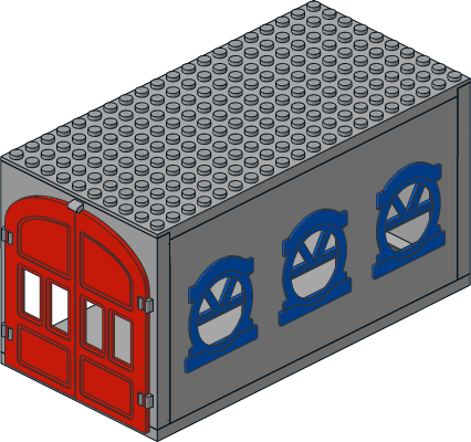 u9310c08.dat - Fabuland Garage Block with Red Doors and Blue One Semicircular and Three Sextant Pane Windows (Complete)