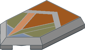 parts/22385pm0.dat - Tile 3 x 2 with Angled End with Dark Orange, Olive Green, Nougat, and Sand Blue Pattern