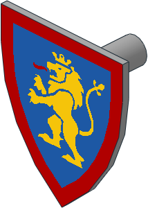 parts/3846p4o.dat - Minifig Shield Triangular with Blue Lion Standing with Raised Foot on Yellow Background with Red Border Pattern