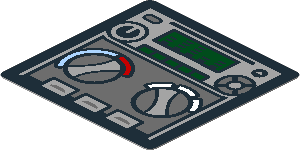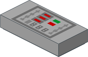 parts/3069bpzk.dat - Tile 1 x 2 with Dark Bluish Grey Rectangle, Metallic Silver, Green and Red Buttons Pattern