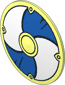 parts/14769ph1.dat - Tile 2 x 2 Round with Three Metallic Gold Discs within Black Rings and Two White Squares within Blue Disc and Black and White Rings Pattern