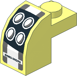 parts/6091dy0.dat - Brick 2 x 1 x 1.333 with Curved Top with Headlamp and Dark Grey Stripes on White Background Right Sticker