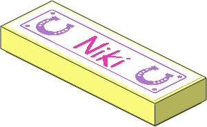 parts/63864df1.dat - Tile 1 x 3 with Two Horseshoes and "Niki" Sticker